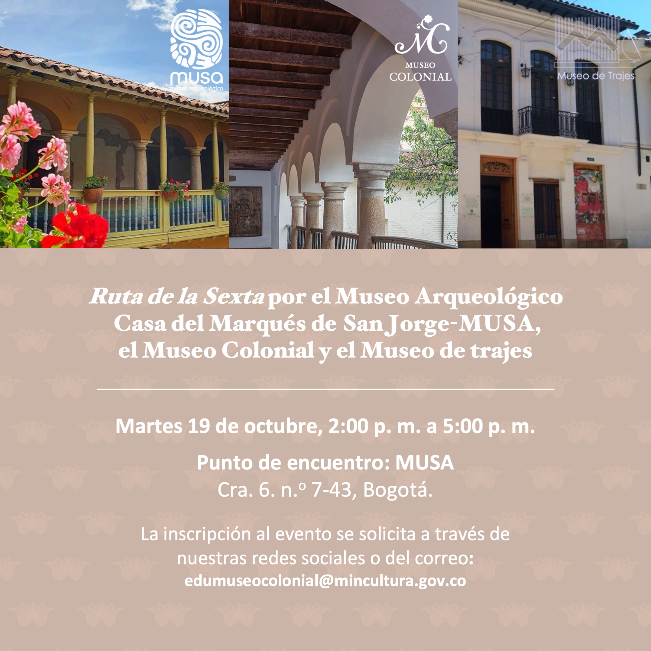 Los museos Arqueológico Casa del Marqués de San Jorge, Colonial y de Trajes, ubicados sobre la carrera sexta, reanudan luego de dos años la tradicional ruta de recorridos por los entornos museales del centro histórico de la ciudad. Invitamos a nuestras audiencias a reconocer estos museos y su legado cultural con un recorrido especializado que esta vez iniciará en el Museo Arqueológico y concluirá en el Museo de Trajes.
