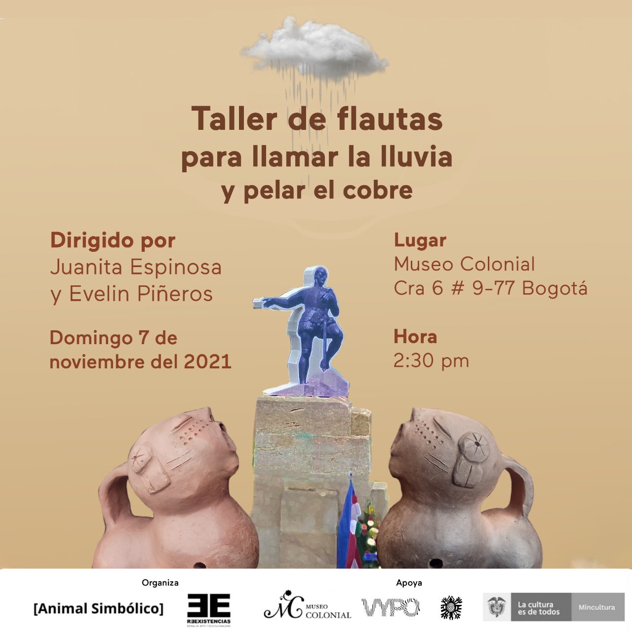 Las talleristas Juanita Espinoza y Evelyn Piñeros proponen este encuentro para crear símbolos de resistencia. Para ello explicarán a los participantes la técnica para modelar ocarinas, instrumentos de viento cuya potencia simbólica es la de llamar las lluvias —como las que derribaron el monumento de cartón de Belalcázar.