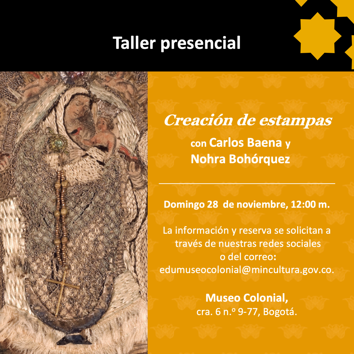 La información y reserva se solicitan a través de nuestras redes sociales o del correo: edumuseocolonial@mincultura.gov.co.